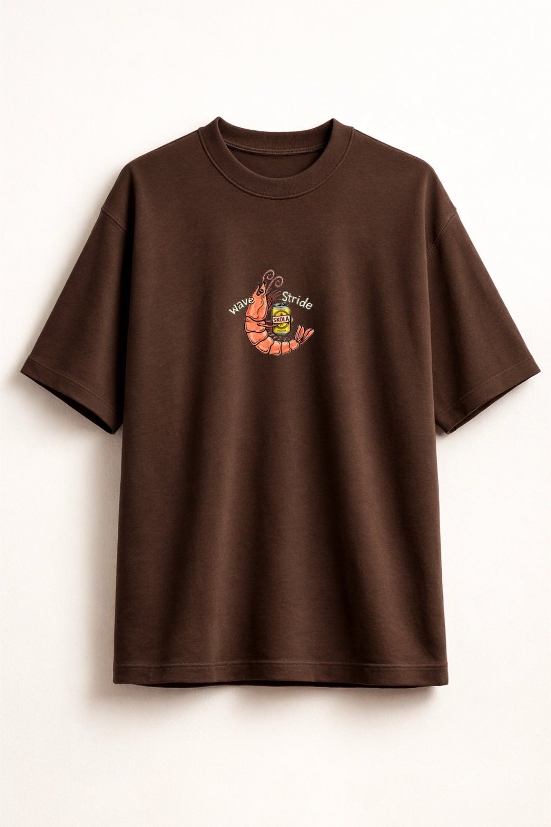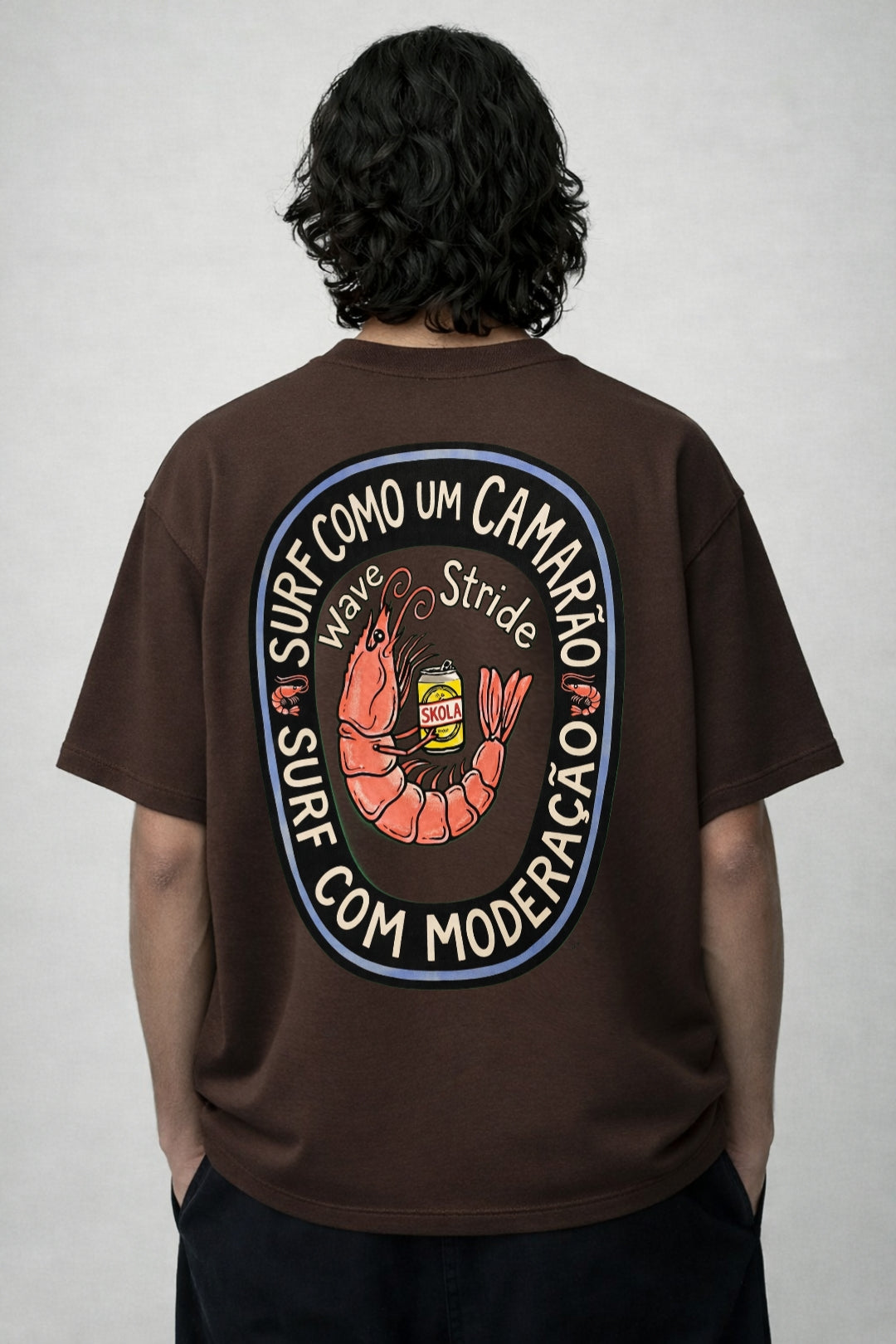 A Shrimp Session é a peça definitiva para quem sabe que o melhor do surf acontece fora da água. Com uma estampa satírica que traz o camarão aproveitando uma "Skola" gelada, esta oversized brinca com o clássico trocadilho: "Surf como um camarão, surf com moderação". É a união perfeita entre a estética street, o tom terroso Earth Brown e o humor ácido do litoral brasileiro.