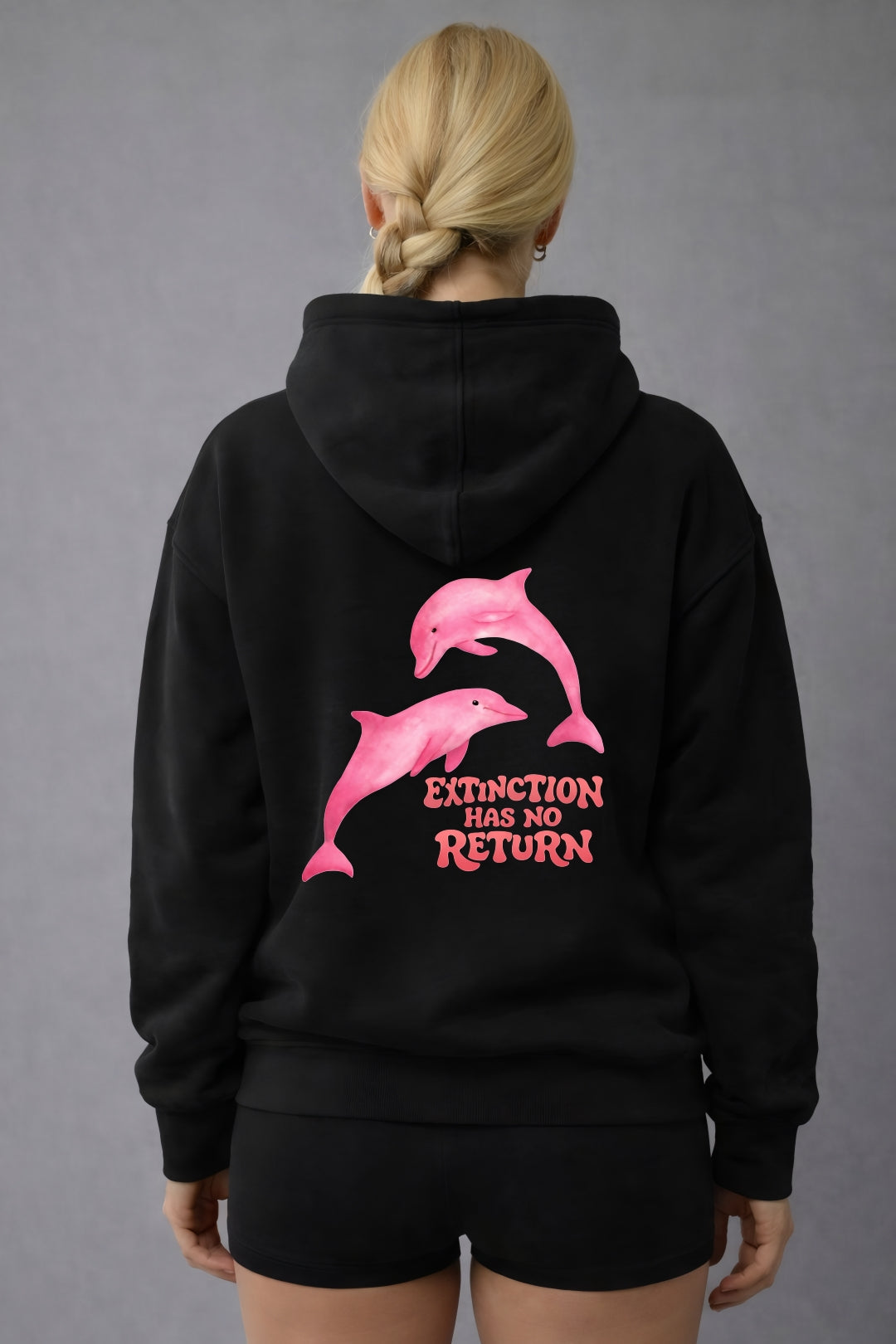 O moletom No Return é mais que uma peça de roupa, tem consciência em cada fibra; é um manifesto visual. Unindo a nostalgia dos gráficos de ONGs ambientais dos anos 90 com a urgência da preservação atual, ele traz o boto cor-de-rosa em destaque com uma mensagem clara: a extinção não tem volta. É a peça ideal para quem busca estilo com propósito e voz.