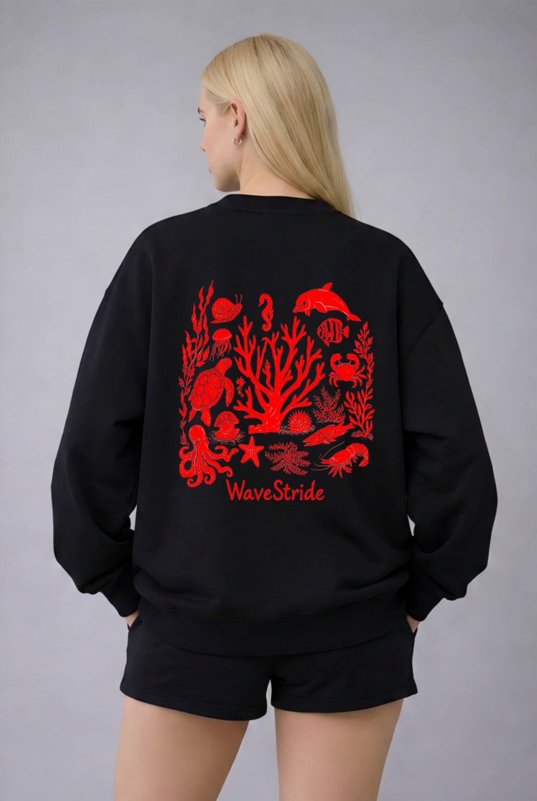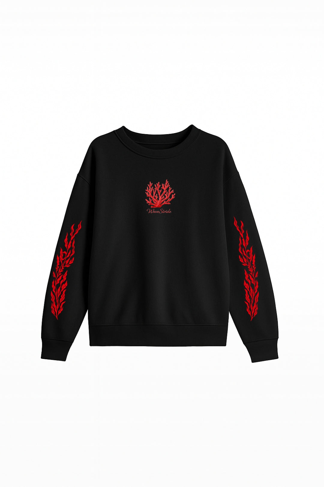 O Red Reef é um manifesto visual da vida submersa. Com uma estampa vibrante em vermelho sobre o fundo preto profundo, esta peça destaca um ecossistema completo: do coral central ao movimento do polvo, tartaruga e golfinho. É a união perfeita entre a estética técnica das antigas surf shops e o conforto essencial para o dia a dia.
