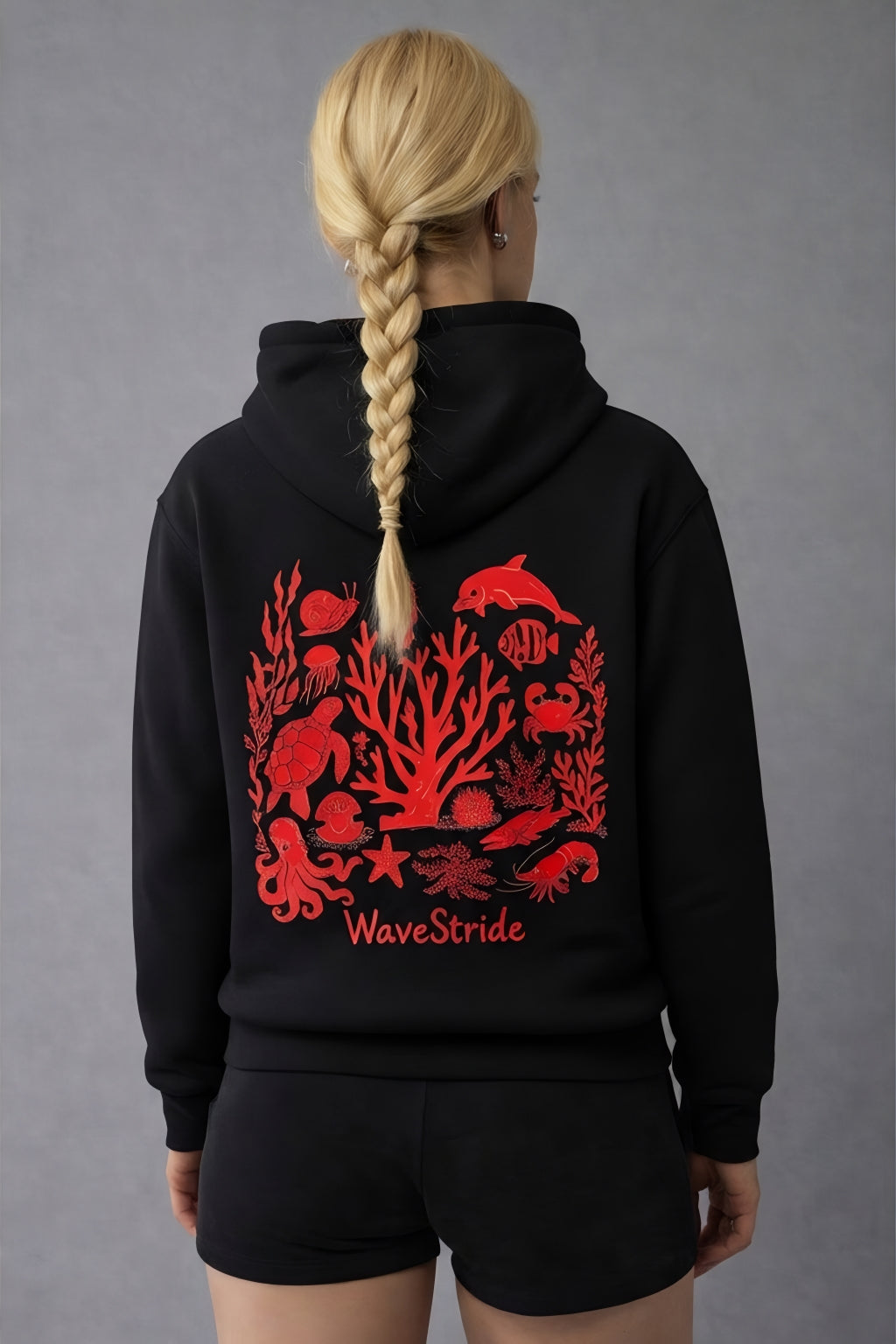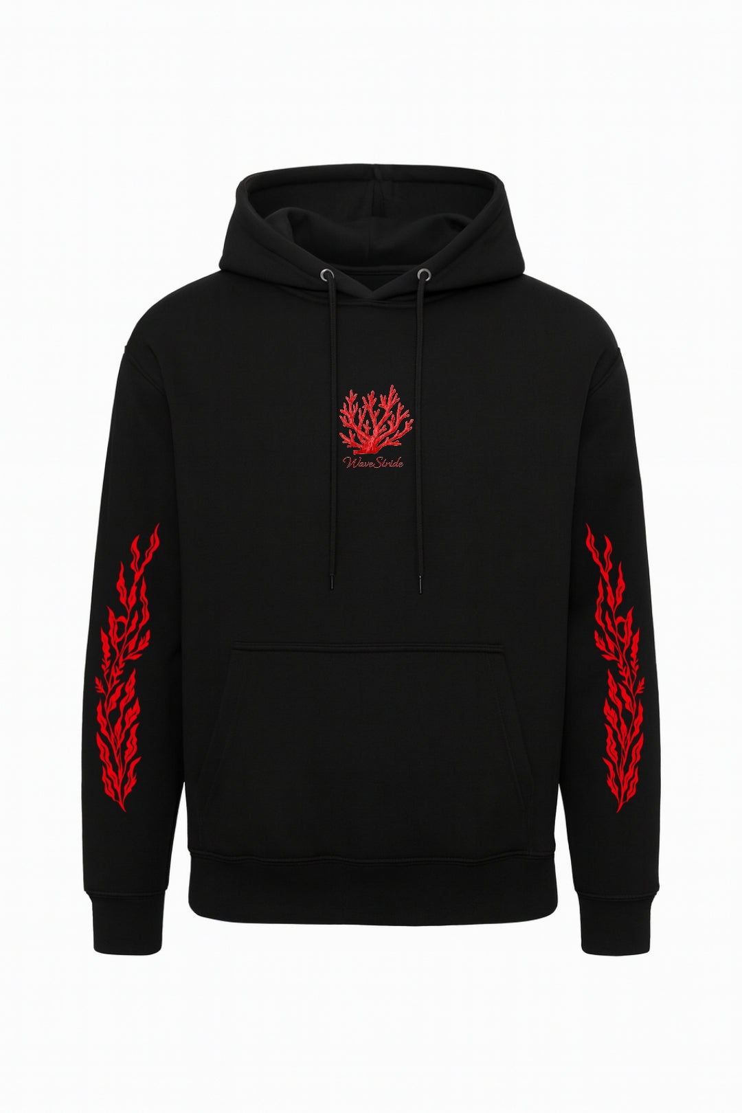 O Red Reef é um manifesto visual da vida submersa. Com uma estampa vibrante em vermelho sobre o fundo preto profundo, esta peça destaca um ecossistema completo: do coral central ao movimento do polvo, tartaruga e golfinho. É a união perfeita entre a estética técnica das antigas surf shops e a robustez de um moletom premium.