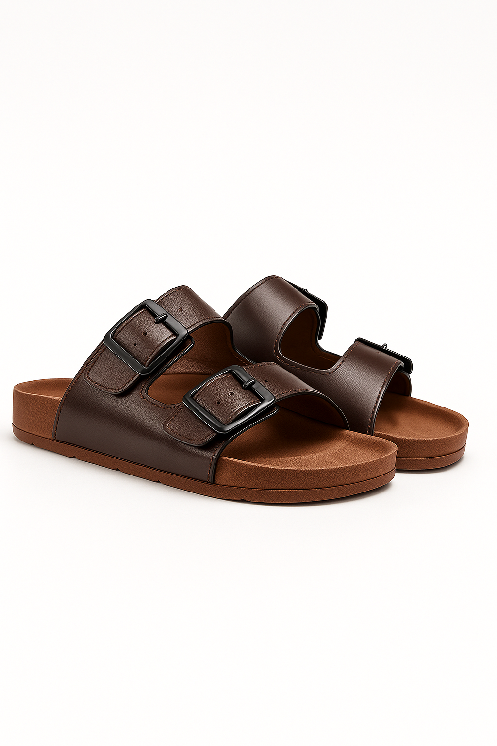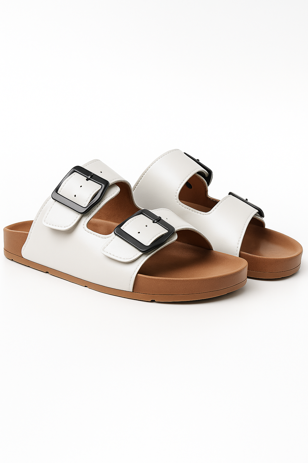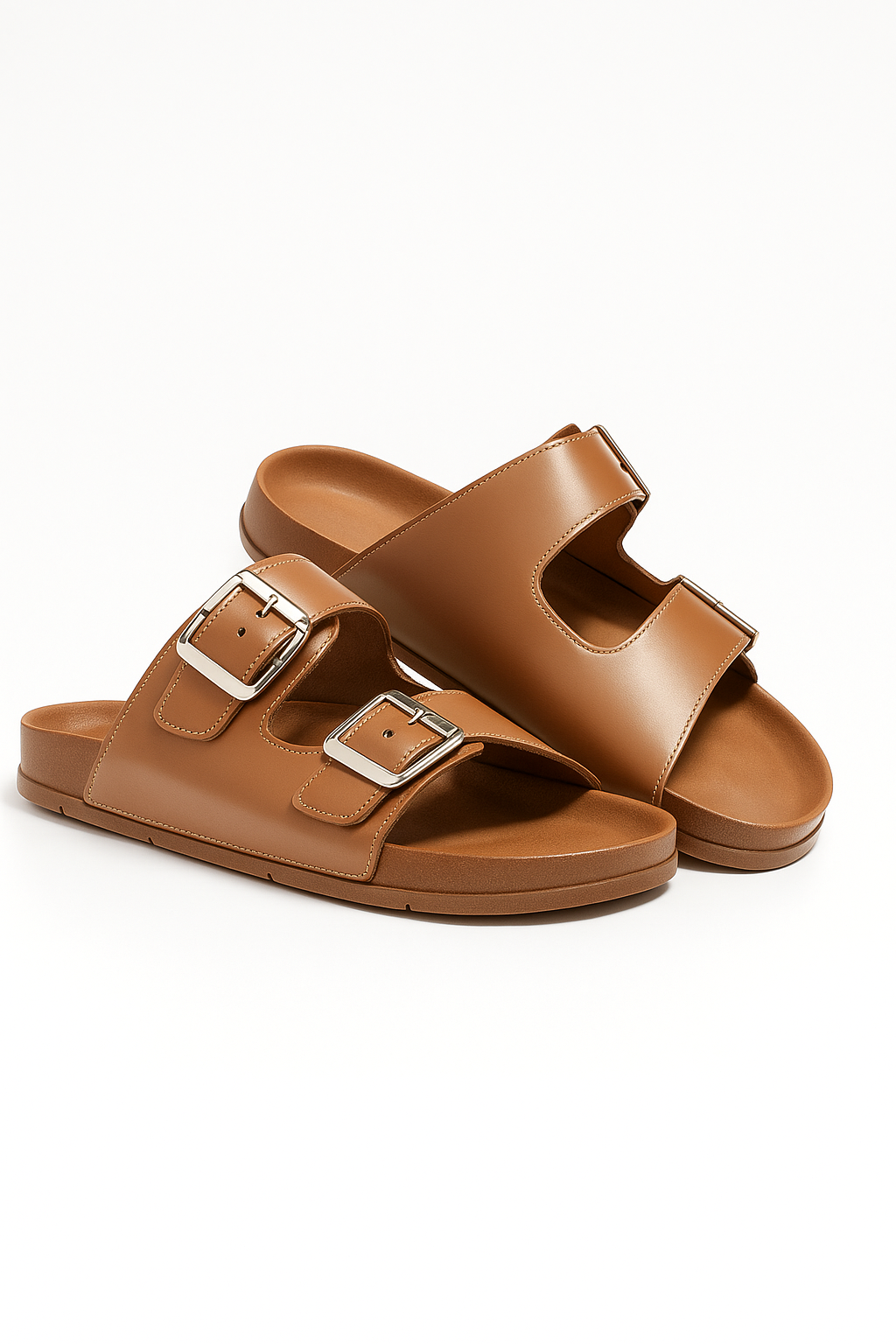 A sandália em couro ecológico é o equilíbrio ideal entre design clássico e o conforto absoluto. Além disso, é feita para quem carrega no estilo a leveza da liberdade e o respeito pelo que importa — o planeta. Com suas duas tiras largas ajustáveis e fivelas metálicas, o modelo oferece um ajuste firme e personalizado, adaptando-se perfeitamente ao formato dos pés.